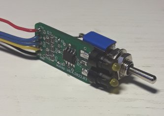 Der OFF-Eingang und seine Beschaltung war dann doch nicht essentiell. Dafür wurde der Schalter bzw. Taster zum Betätigen z.B. eines Servotreibers mit integriert, so dass ein kompaktes Modul zum Einbau in ein Stellpult entstand. Die LEDs können dabei in verschiedenen Abständen aufgelötet werden, um unterschiedliche Rastermaße des Stellpults zu unterstützen.
