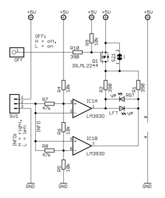 Steigt INFO über 3,3V, wird Ausgang 1 an GND geschaltet, LED "RGT" leuchtet.