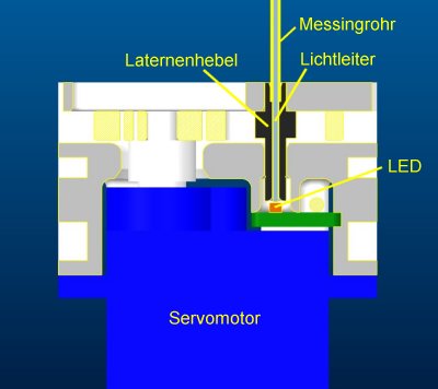 Um alles im Antrieb zu behalten und bewegte Drähte zu vermeiden, die mit der Zeit brechen können, wurde die Lösung mit Lichtleiter gewählt. Dazu sitzt im Antrieb eine kleine Platine mit einer SMD-LED, die von unten in die Bohrung des Laternenhebels leuchtet. Für eine möglichst hohe Lichtausbeute sollte der Lichtleiter dann durch Messingrohr und Laternenhebel bis fast auf diese LED heruntergeführt werden.