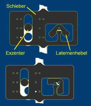 Nahe der Mittelstellung des Schiebers greift der Zapfen in die Bohrung des Laternenhebels und dreht diesen um ±45°. Ist die Endstellung der Laterne erreicht (unten, nach ca 1,5mm), verlässt der Zapfen die Bohrung und bewegt sich weiter entlang des Arms, ohne die Laterne weiter zu drehen und hält sie dabei gleichzeitig in der Position.